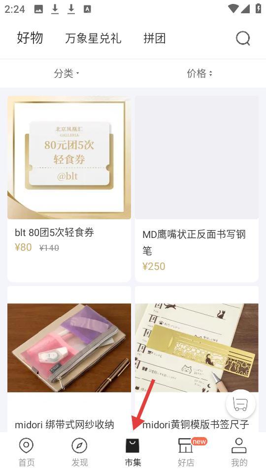 2、點擊市集界面,涵蓋好物、拼團等板塊,展示輕食券、文具等商品,提供多樣購物選擇。