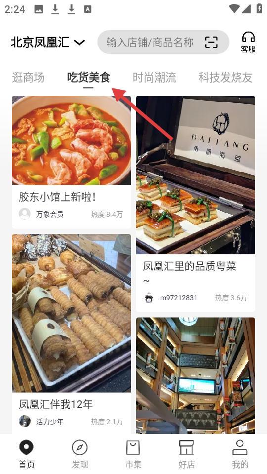 3、點擊發現頁面的吃貨美食分區,呈現膠東小館等美食資訊,依熱度展示餐廳及用戶分享內容。