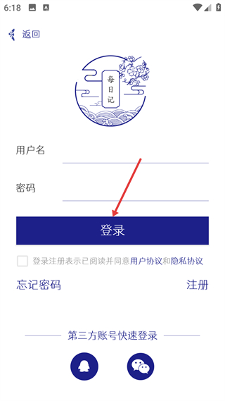 1、登錄支持用戶名密碼方式,需勾選同意相關協議,同時提供QQ、微信第三方快捷登錄,是進入應用的必要流程。