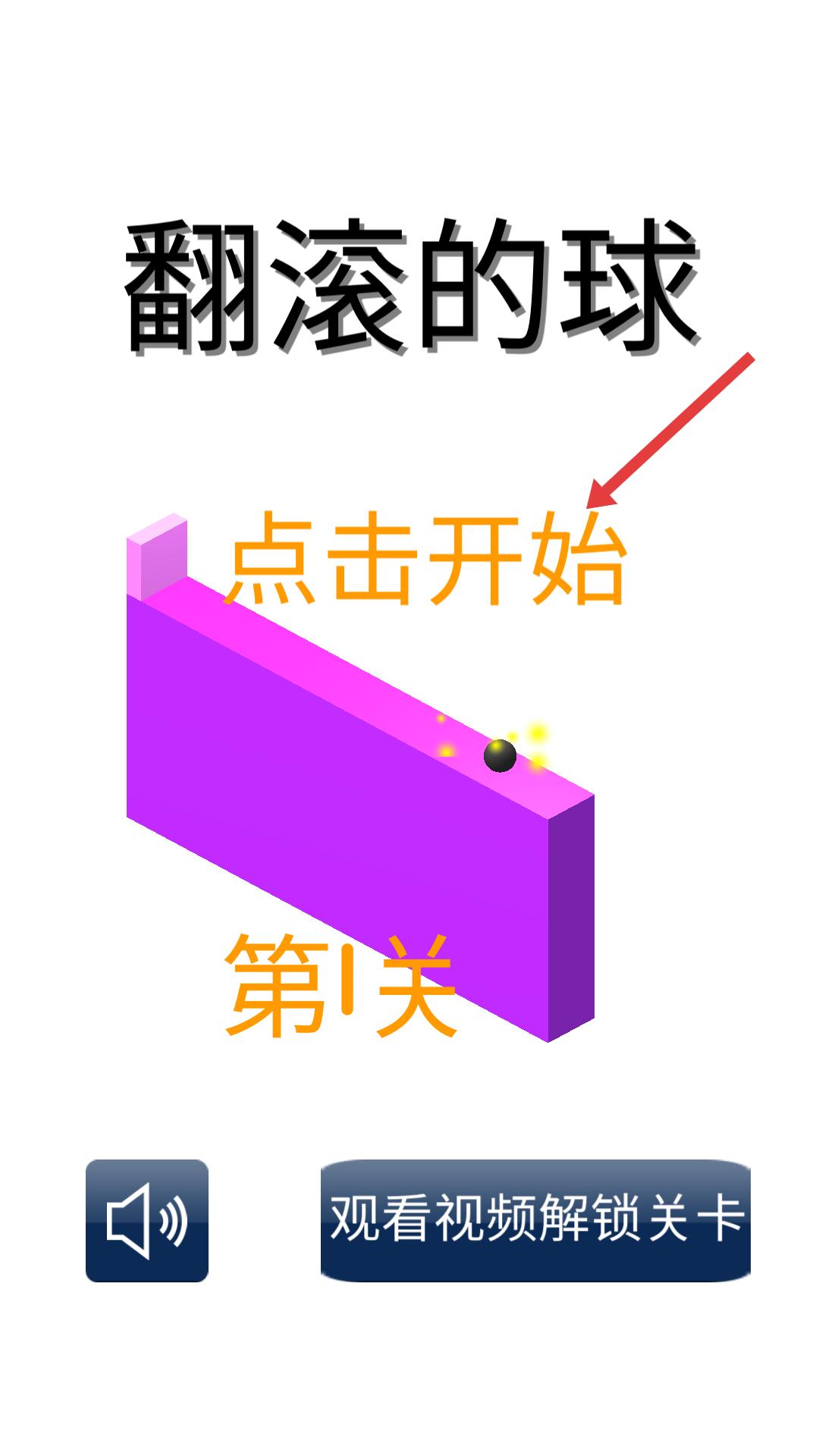 1、游戲第一關界面,有點擊開始提示,點擊后黑色小球會在紫色平臺上開始滾動,開啟第一關的挑戰,要控制小球移動。