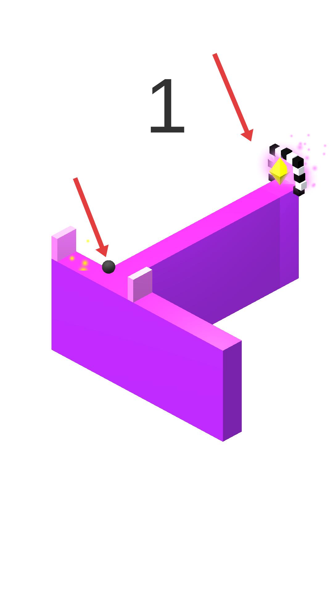 2、第一關黑色小球需沿著紫色平臺滾動,朝著帶有黑白條紋和菱形的目標位置前進,到達該位置即可通關。