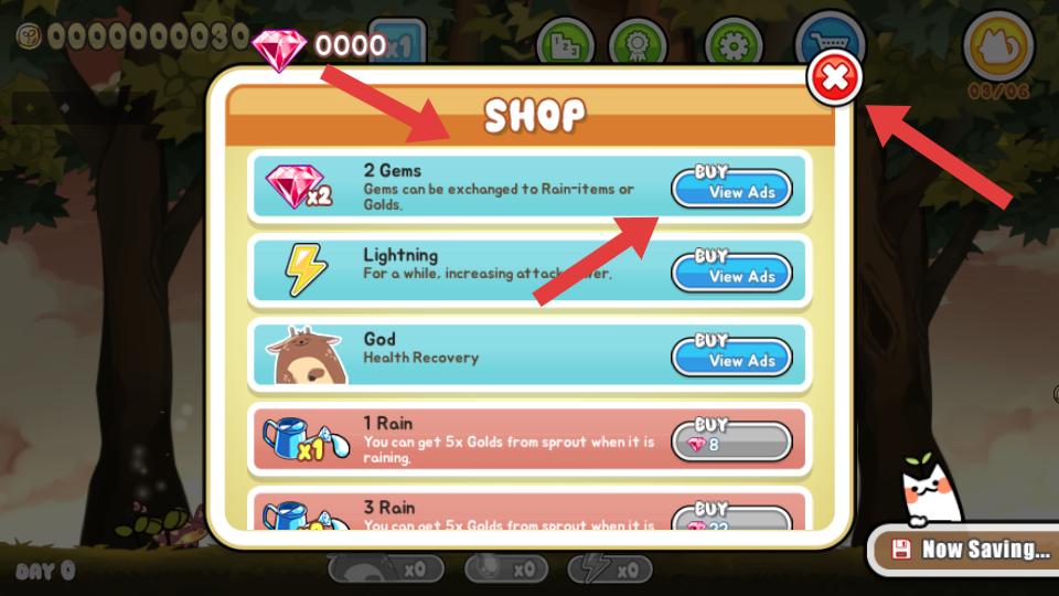 3、進入商店有寶石,閃電等道具,可通過看廣告購買,利用這些道具,助力貓咪在冒險里更順利。