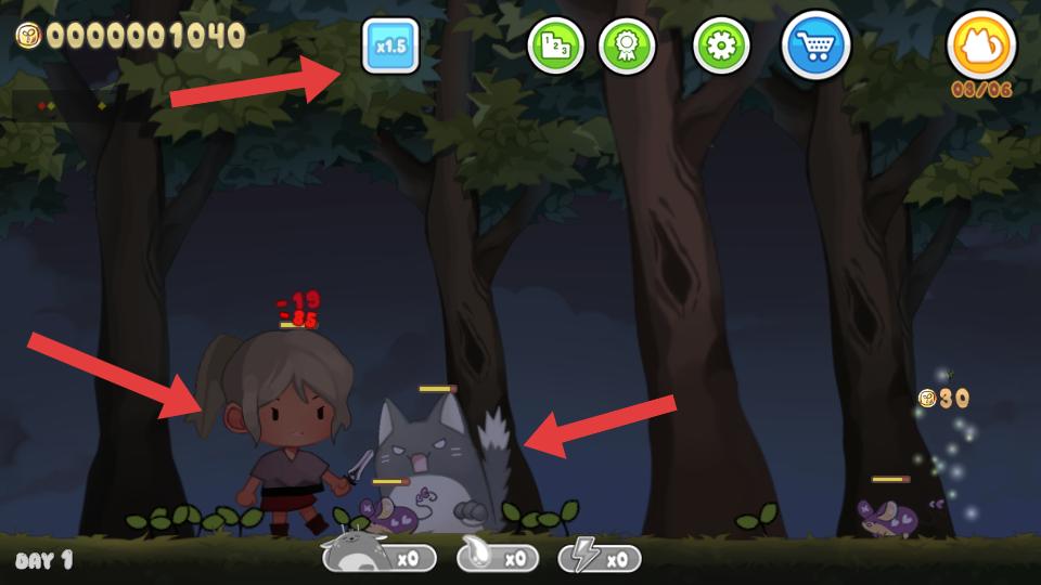 4、冒險時操控貓咪與角色一起,對抗遇到的敵人,過程中收集金幣,提升實力,持續展開新的冒險。