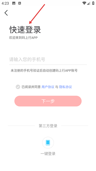 1、先進入快速登錄界面,輸入手機號勾選已閱讀并同意用戶協議與隱私協議,點擊下一步,未注冊的手機號驗證后自動創建該APP的賬號。