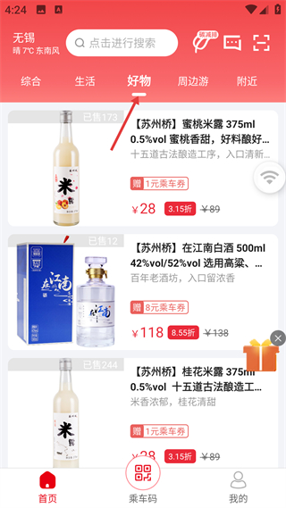 2、登錄后進入首頁,點擊好物板塊,能看到蘇州橋系列商品,像蜜桃米露在江南白酒等,還有對應的價格折扣以及乘車券類的贈品。