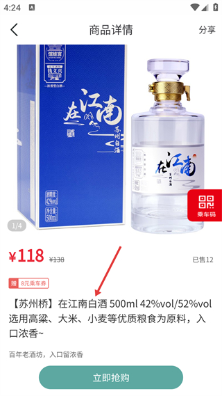 3、選擇在江南白酒進入商品詳情頁,可看到它的價格原料等信息,這款酒用優質糧食釀造,入口濃香同時還有8元乘車券可領取。