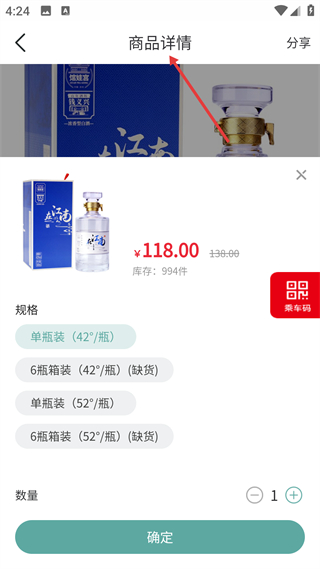 4、點擊立即搶購彈出規格選擇界面,能選單瓶裝的42°或52°,6瓶箱裝顯示缺貨,還可調整購買數量之后點擊確定按鈕。