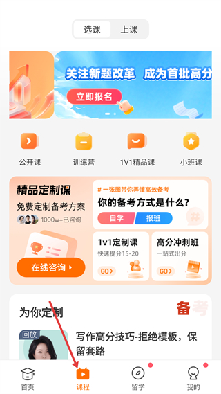 2、課程頁面分選課、上課欄,有公開課、訓練營等課程類型,提供精品定制課,可免費定制備考方案,也有寫作高分技巧等定制內容。