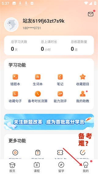 4、我的頁面展示用戶學習數據,有錯題本、生詞本等學習功能,還有備考時長測算等工具,助力用戶高效備考。