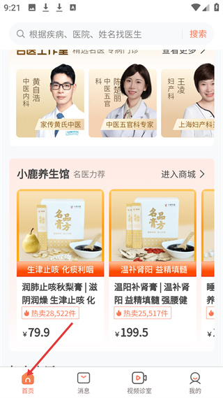 1、首頁展示多科室醫生,小鹿養生館有名醫力薦養生膏方,如潤肺止咳秋梨膏、溫陽補腎膏等,標注熱賣件數和價格,方便選購。
