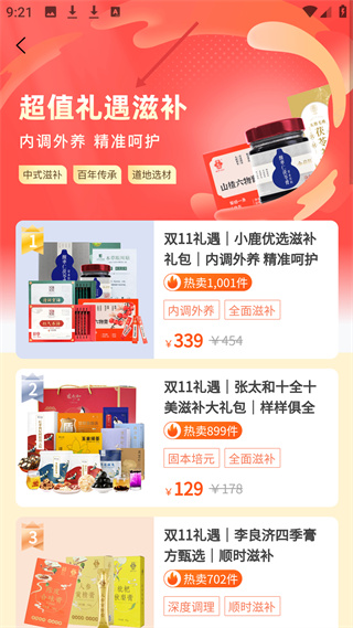 2、推出超值禮遇滋補活動,有小鹿優選滋補禮包、張太和滋補大禮包等,強調中式滋補,雙11優惠,滿足內調外養需求。