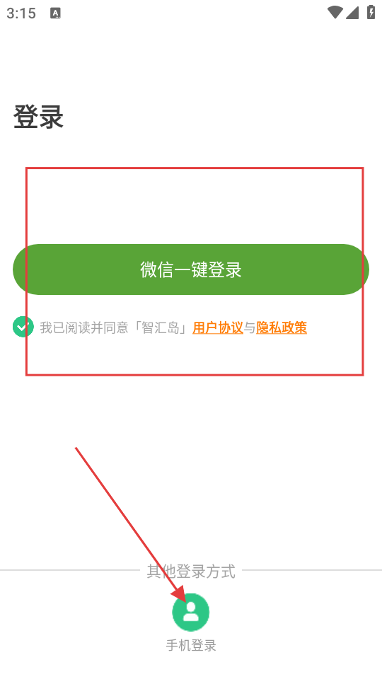 2、在登錄界面,可選擇微信一鍵登錄,勾選同意用戶協議與隱私政策,也可選擇手機登錄方式。