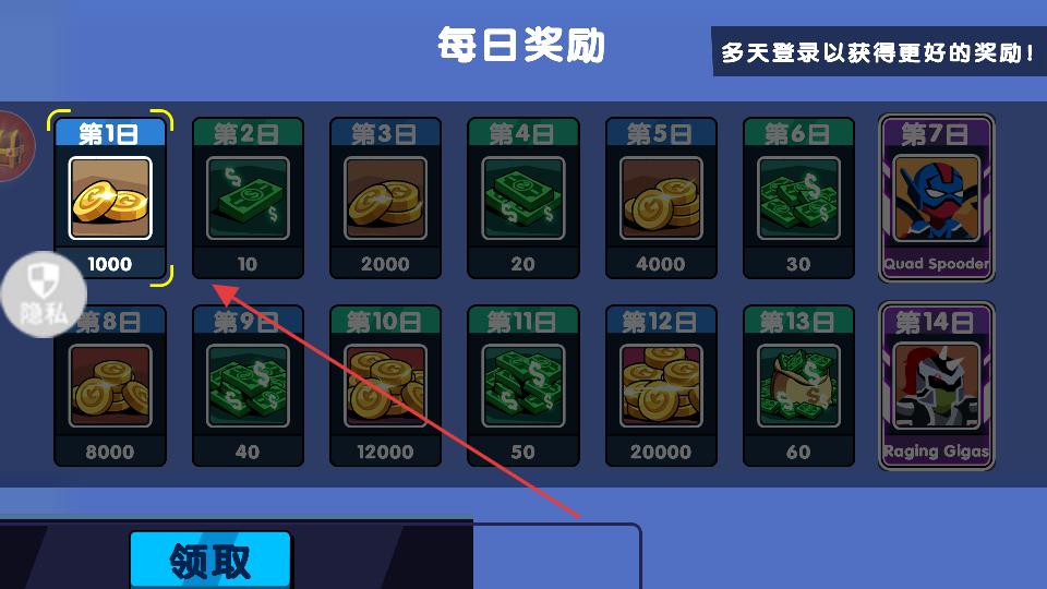 1、進入每日獎勵界面,查看第1日獎勵為1000金幣,點擊下方領取按鈕,獲取該日金幣資源,這些資源可用于角色升級或道具購買,為后續戰斗儲備物資支撐。
