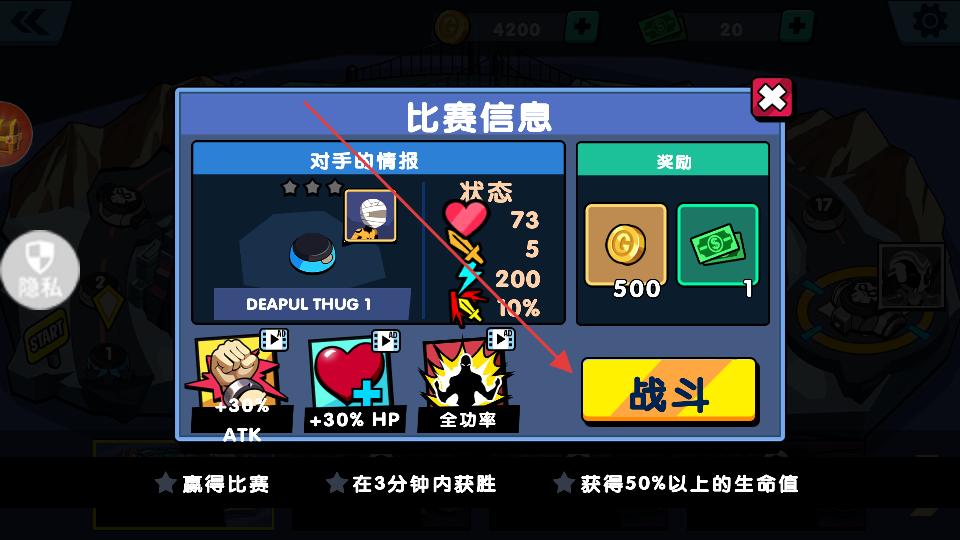 3、比賽信息界面中,確認對手狀態和增益效果,點擊戰斗按鈕,加載進入對戰場景,雙方角色DAEPUL與DEAPUL THUG 1登場,準備格斗對決。