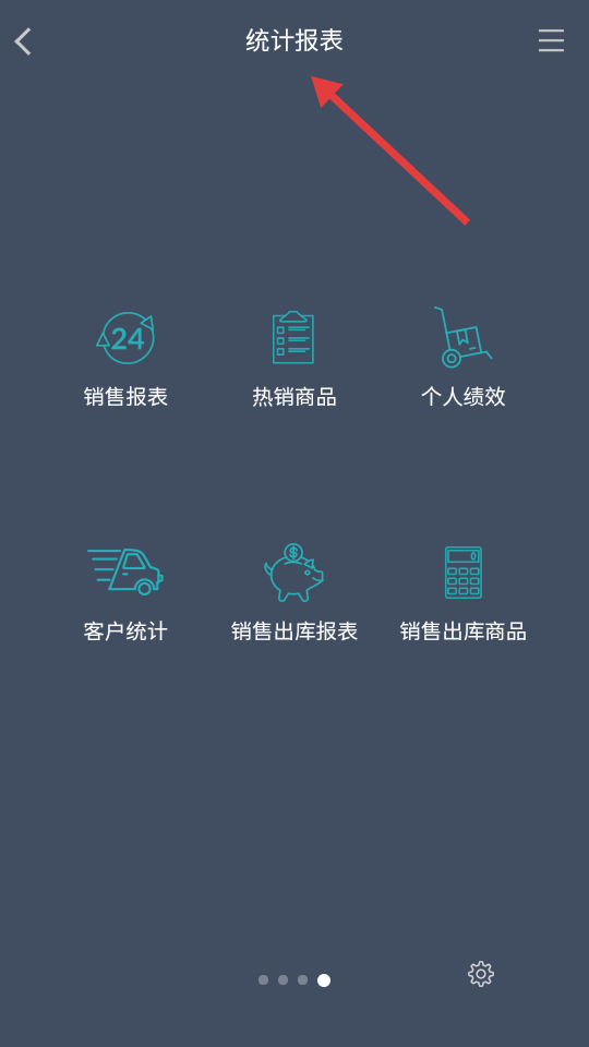 1、統計報表頁面標題醒目,下方設有銷售報表、熱銷商品、個人績效等多種統計功能入口,布局簡潔。