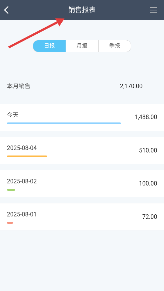 2、銷售報表界面可切換日報、月報、季報,清晰呈現本月及特定日期銷售金額,數據展示直觀。