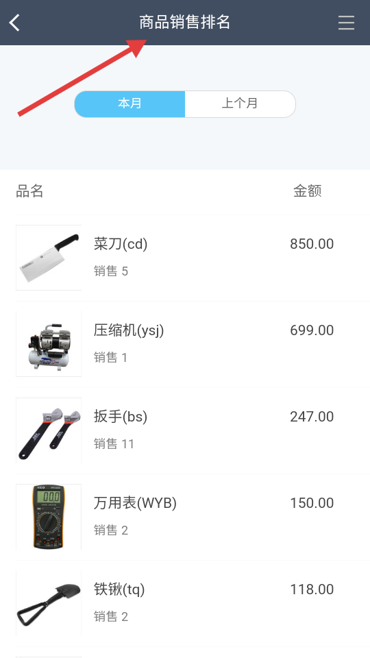 3、商品銷售排名頁能對比本月與上月,羅列菜刀、壓縮機等商品品名、銷量及金額,信息一目了然。