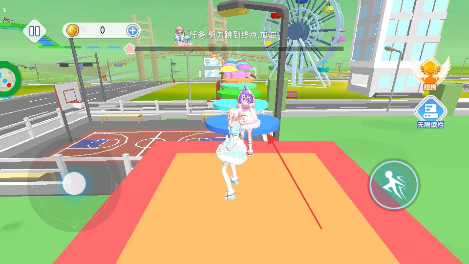 4、行至蹦床區域,點擊右側跳躍按鈕,角色踏上蹦床彈起,借助彈力跨越間隙,持續向彩虹樓梯頂端移動,重復跳躍動作,應對后續蹦床或障礙,穩步推進至終點。