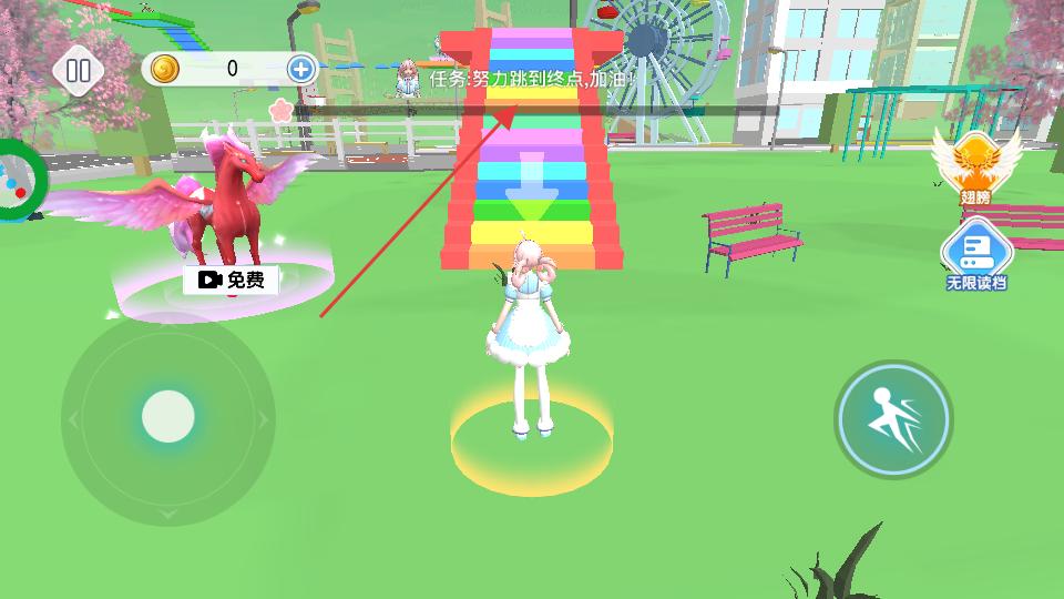 3、進入奔跑模式關卡,操控底部虛擬搖桿移動角色,朝著彩虹樓梯方向行進,觀察場景布局,規劃路徑避開潛在障礙。