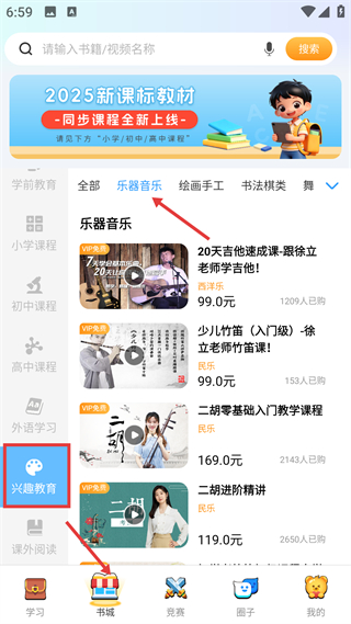 1、樂器音樂類含吉他、竹笛等課程,覆蓋入門到進階內容,標注價格與購買人數,適配不同樂器愛好者的學習需求。