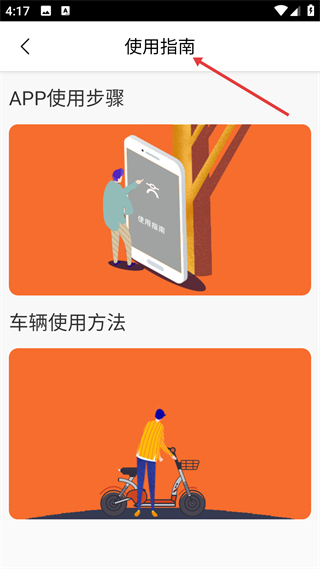 2、使用指南分APP使用步驟與車輛使用方法,以圖文指導操作,是幫助用戶掌握應用與車輛使用的說明板塊。