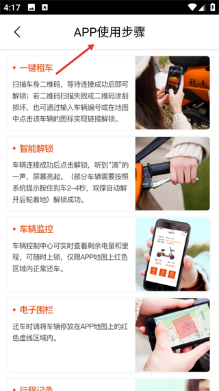 3、APP使用步驟詳解租車解鎖等流程,含還車區域車輛監控規則,幫助用戶規范使用應用完成騎行流程。