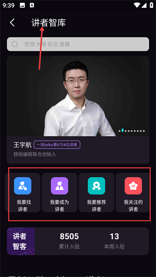 3、進入講者智庫頁面,能看到講者信息展示,還有我要找講者我要成為講者等功能按鈕,同時可查看累計入駐及本周入駐的講者數據。