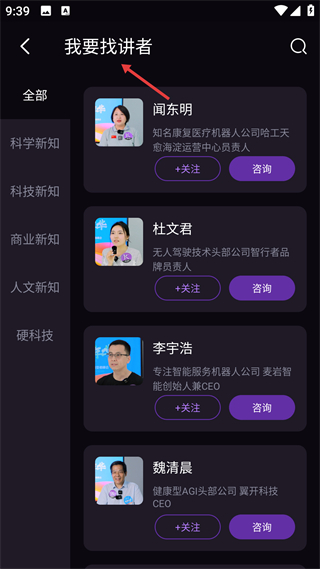 4、進入我要找講者頁面,左側有全部科學新知等分類可篩選,右側展示各領域講者信息,可點擊關注或咨詢按鈕與對應講者互動。