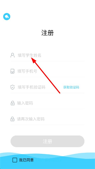 2、若未注冊賬號,可點擊免費注冊進入注冊界面,按提示填寫學生姓名、手機號,獲取并填寫驗證碼后設置密碼,完成注冊。