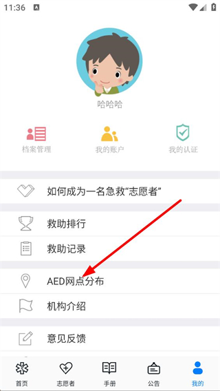 1、進入先看到我的界面,這里有檔案管理我的賬戶我的認證等功能,還能找到AED網點分布選項,先熟悉這些基礎功能。