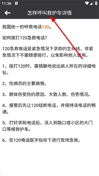 3、選擇怎樣呼叫救護車主題,能看到我國統一呼救電話120,還有撥打120的詳細步驟,學習這些要點掌握呼救方法。
