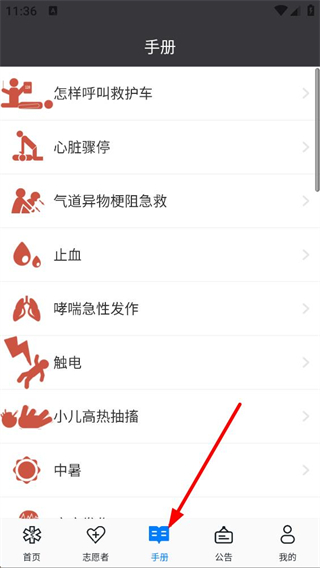 2、點擊手冊按鈕進入手冊界面,這里有怎樣呼叫救護車心臟驟停等多個急救主題,可選擇對應主題了解具體急救知識。