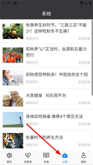 4、點擊公告按鈕進入系統界面,這里有秋季養生等健康資訊,可查看這些內容,補充更多健康相關的知識儲備。