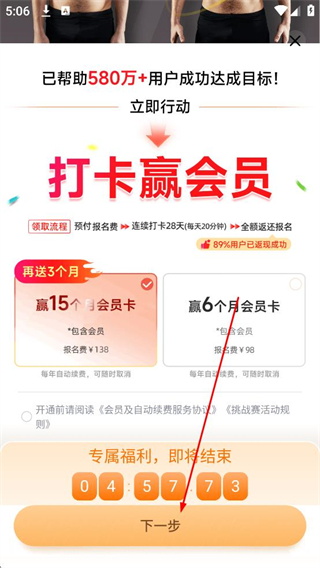 2、在打卡贏會員活動頁面,了解活動福利后點擊下一步,進入課程選擇頁面。