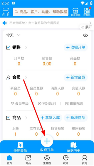 1、進入系統首頁,可查看銷售會員商品相關數據,點擊底部收銀開單按鈕,即可進入開單流程,該功能是門店日常收銀操作的核心入口。