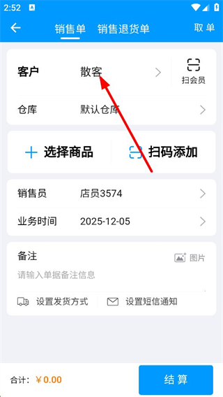 2、進入銷售單界面,客戶默認顯示散客,可選擇商品或掃碼添加商品,還能設置倉庫業務員時間等信息,確認信息后可進行結算操作。