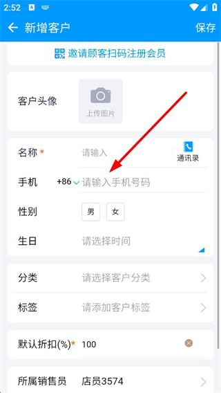 4、進入新增客戶界面,需填寫名稱手機號碼等必填信息,還能設置性別生日分類等內容,填寫完成后點擊保存即可完成客戶信息新增。