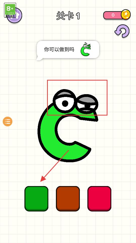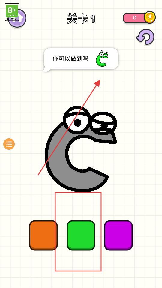 1、點擊開始按鈕,進入第一關,界面展示帶有卡通形象的字母C,下方有不同顏色的方塊,準備根據提示為字母C選擇合適的顏色進行涂色。