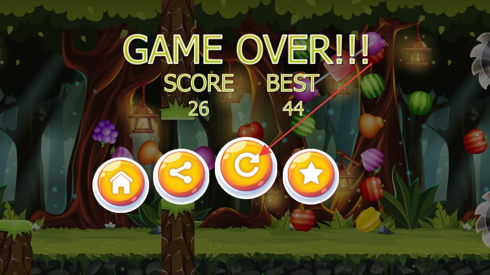 4、若小動物碰到障礙導致游戲結束,界面會顯示GAMEOVER以及當前得分和最佳得分,此時點擊重新開始按鈕,再次進入游戲,挑戰更高的分數和收集量。