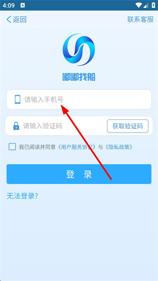 2、點擊登錄后進入對應界面,界面顯示嘟嘟找船標識,需輸入手機號再獲取并填寫驗證碼,勾選同意協議后點擊登錄按鈕完成賬號登錄。