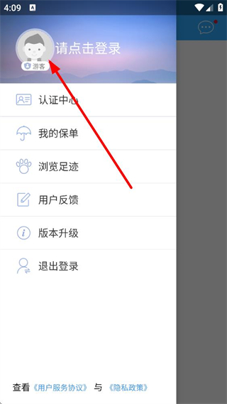 1、進入個人中心界面,顯示游客身份及請點擊登錄的提示,同時列有認證中心我的保單等功能選項,可依據自身需求選擇對應的操作選項。
