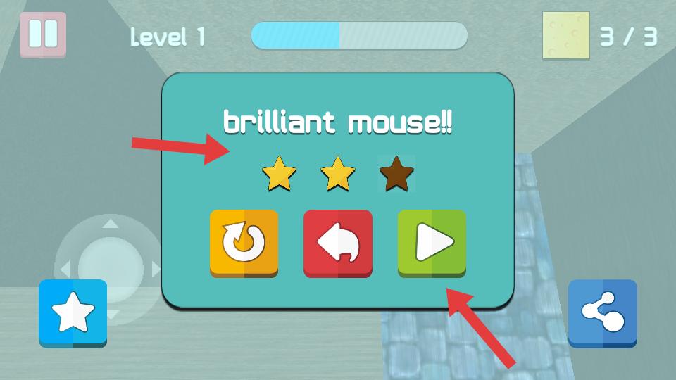 4、成功收集所有奶酪后,會顯示brilliant mouse,獲得星級評價,可選擇重新開始,返回或進入下一關繼續挑戰。