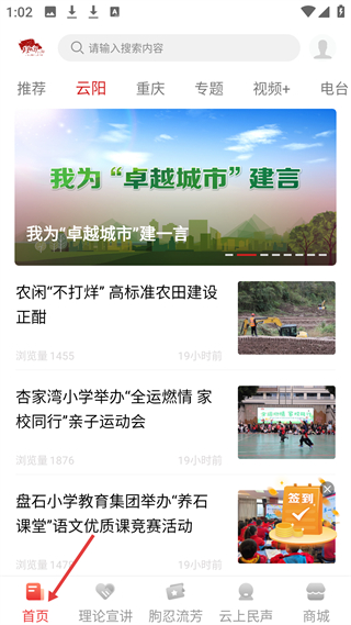 1、打開智慧云陽app,可以看見云陽當地的熱點新聞事件,比如雙龍鎮開展老年人工藝拍照志愿者等,點擊即可閱讀。