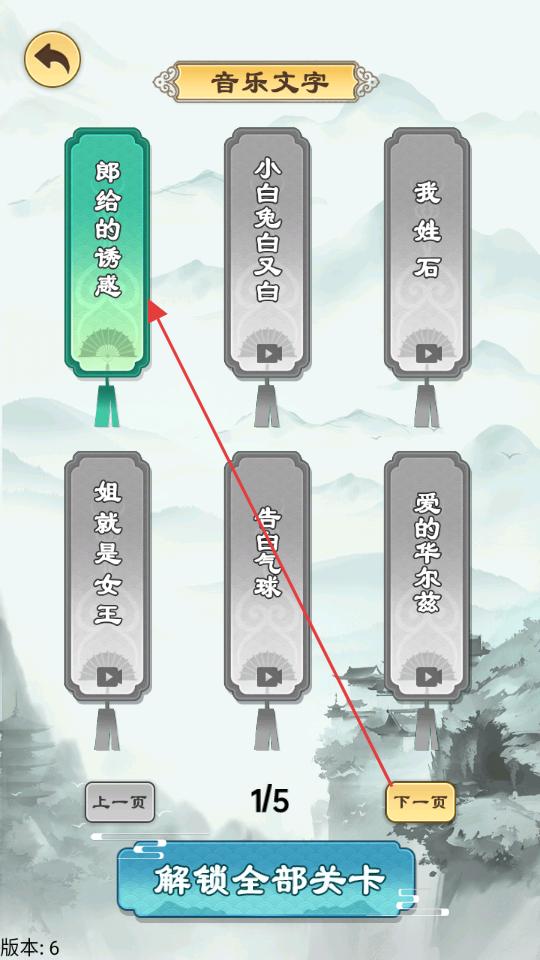 1、在游戲主界面,選擇帶有音樂元素的關卡分類,進入包含郎給的誘惑等關卡的列表頁面,查看可挑戰的音樂文字關卡。