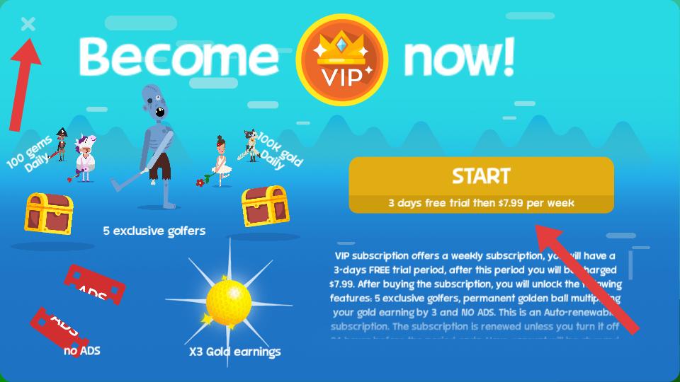 1、進入游戲,可選擇開啟VIP,獲取每日寶石,專屬高爾夫球手等特權,也可關閉彈窗,直接開始游戲。