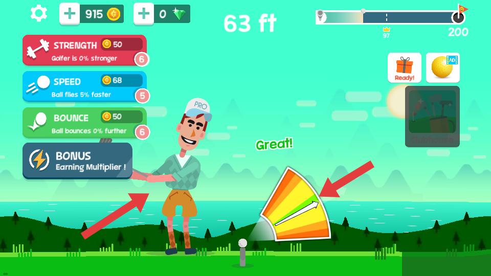 2、游戲時調整力量,速度等屬性,看準時機擊球,讓高爾夫球朝著目標方向飛行,爭取更好的擊球效果。