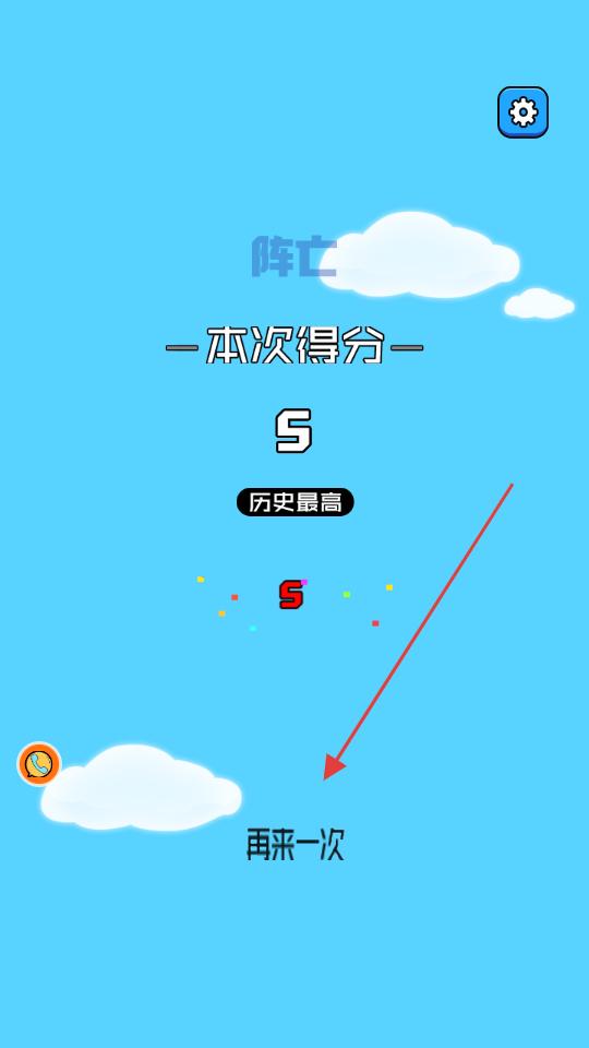 4、若小羊沒跳到方塊上掉落,游戲結束,屏幕顯示本次得分和歷史最高得分,點擊再來一次,重新開始游戲,再次嘗試跳躍方塊積累分數。