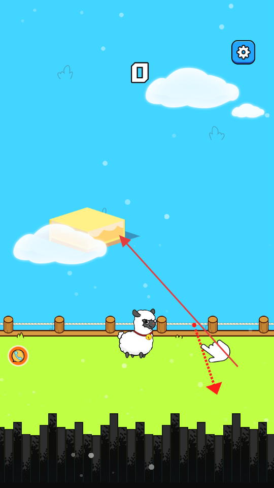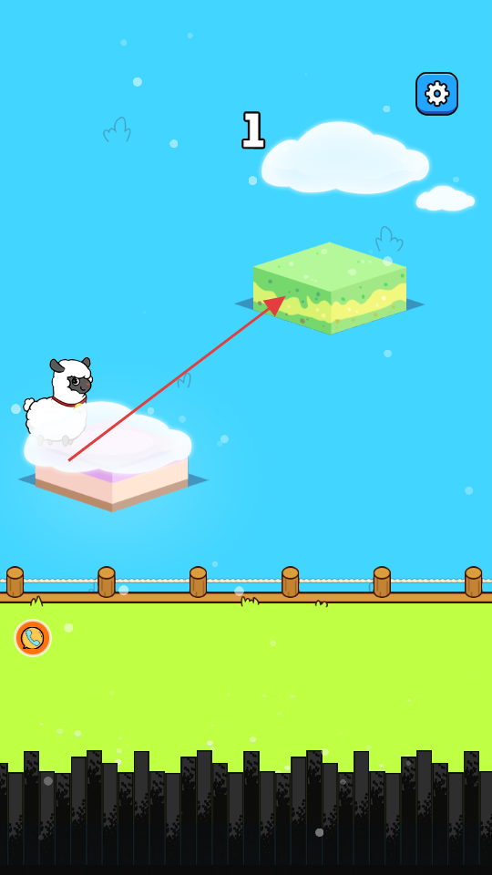 1、小羊初始在草地上,瞄準空中方塊,滑動屏幕讓小羊跳躍,成功跳到方塊上,上方分數變為1,開啟方塊跳躍的闖關過程。