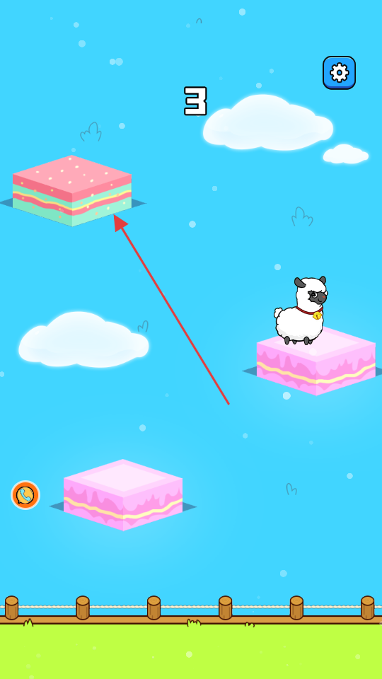 2、小羊站在方塊上,瞄準下一個綠色方塊,滑動屏幕使小羊跳躍,精準落在綠色方塊上,分數隨之增加,保持跳躍的連貫性。