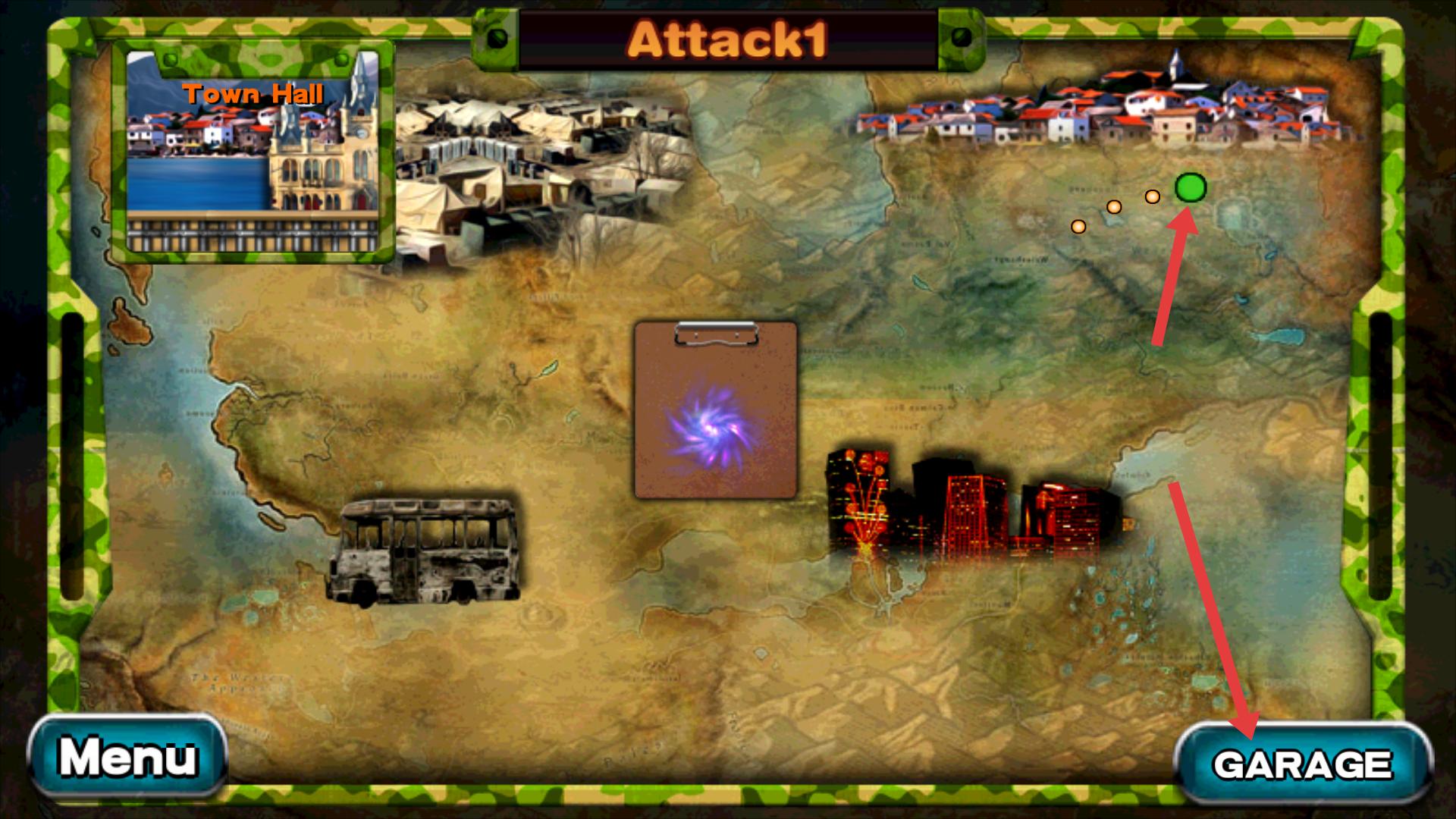 2、進入地圖界面,能看到Attack1等標識,還有GARAGE按鈕,點擊可進入車庫,查看或選擇車輛,根據地圖上的綠色標記,前往目標地點,推進任務。